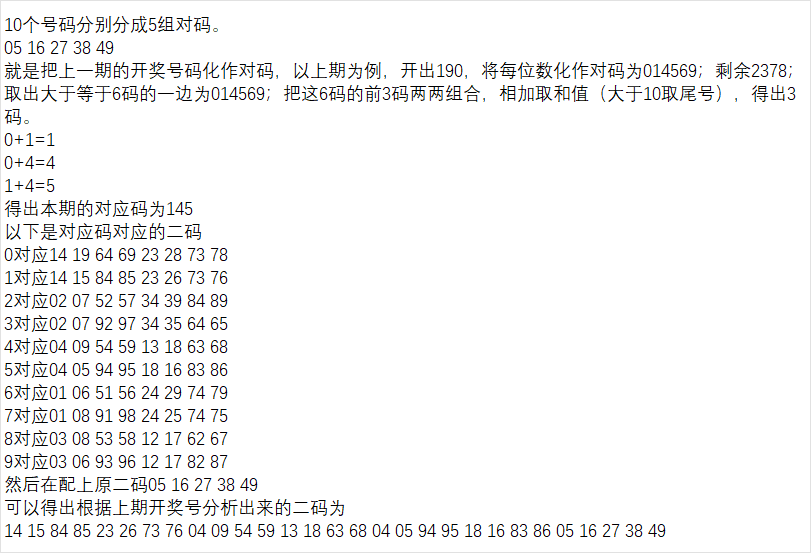 以上期为例,上期开出190,和值是10,和尾为0,对应码为2378,则本期胆组一为2378。