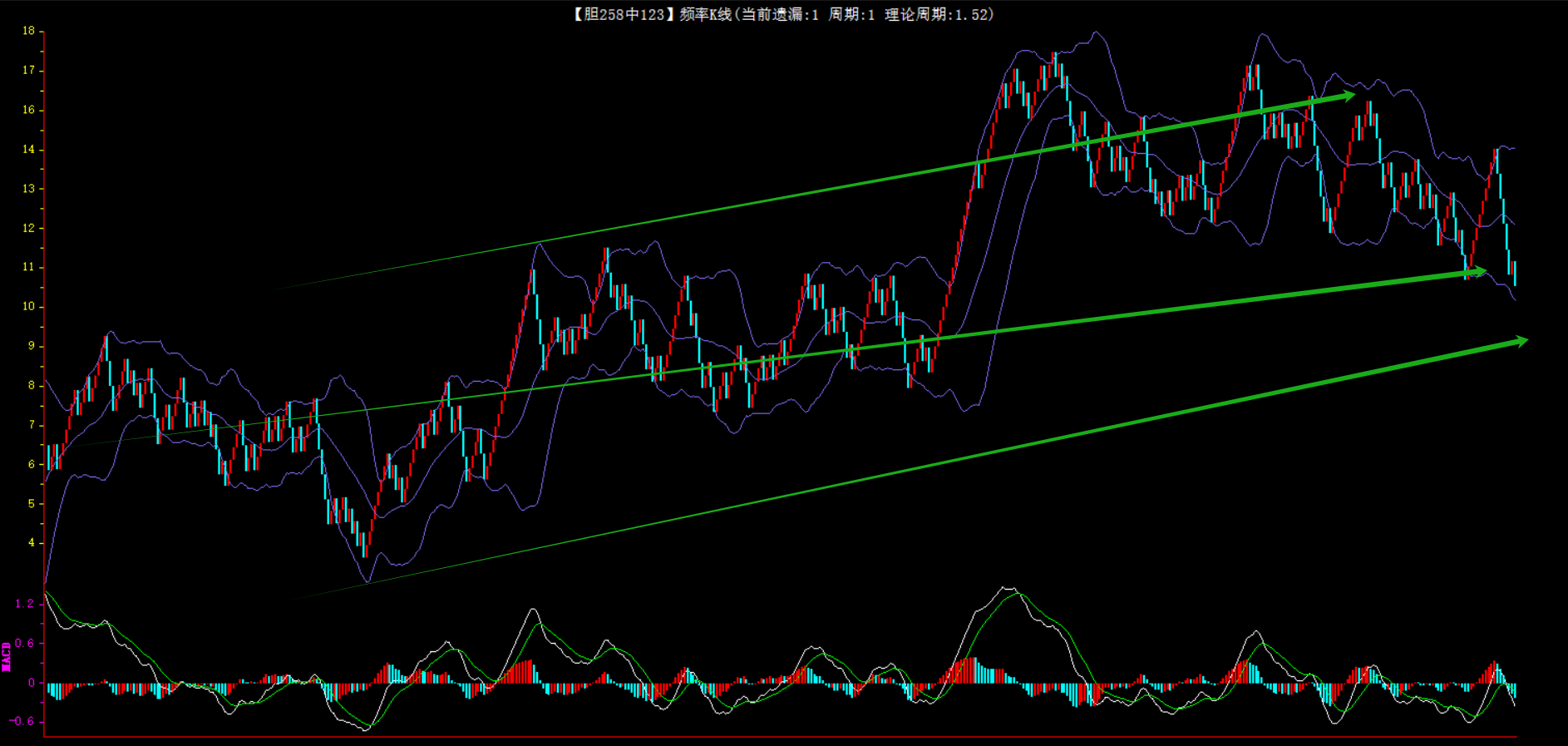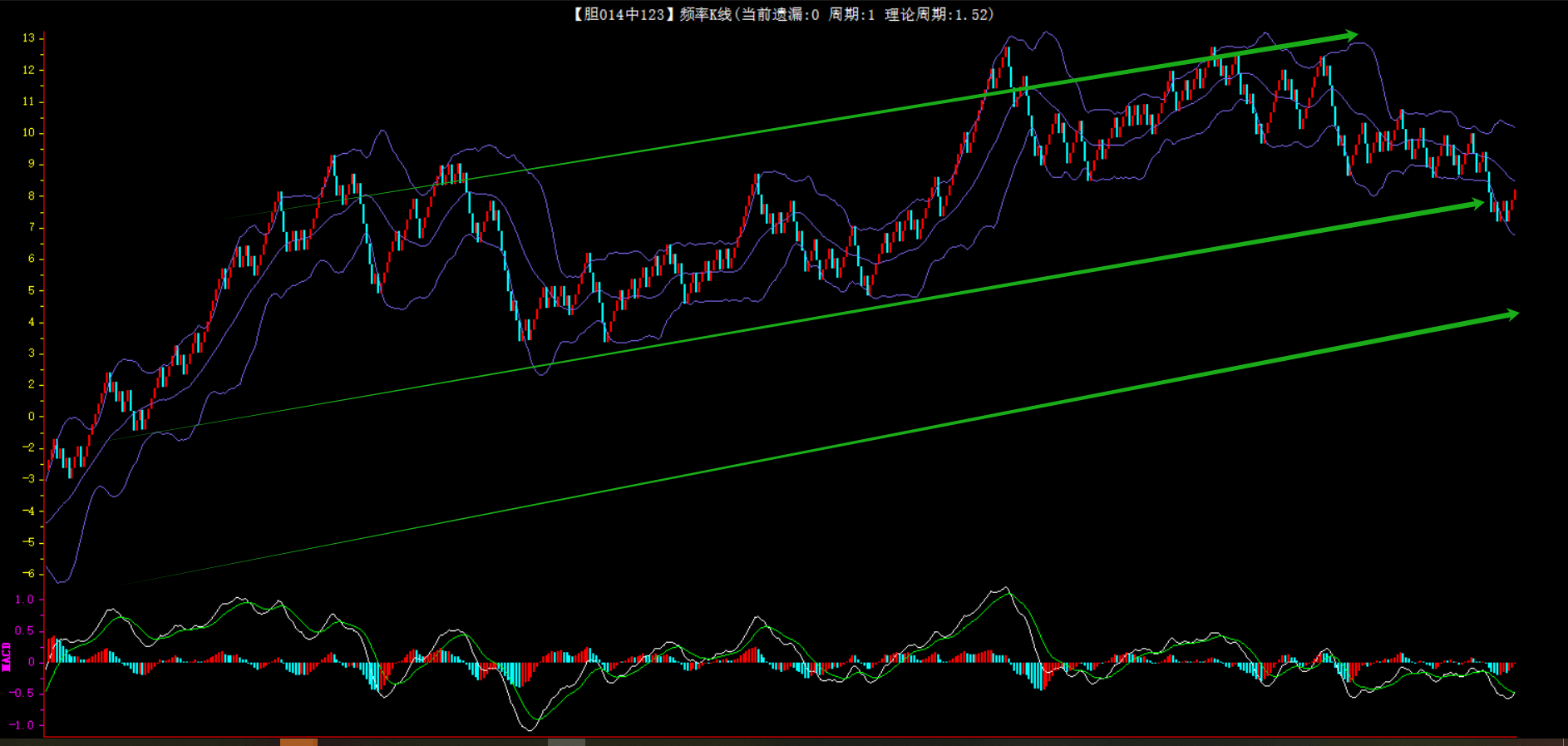 整体趋势上行,上边沿线趋势向上,下边沿趋势也是向上,节点震荡,当前遗漏1期,本期关注。