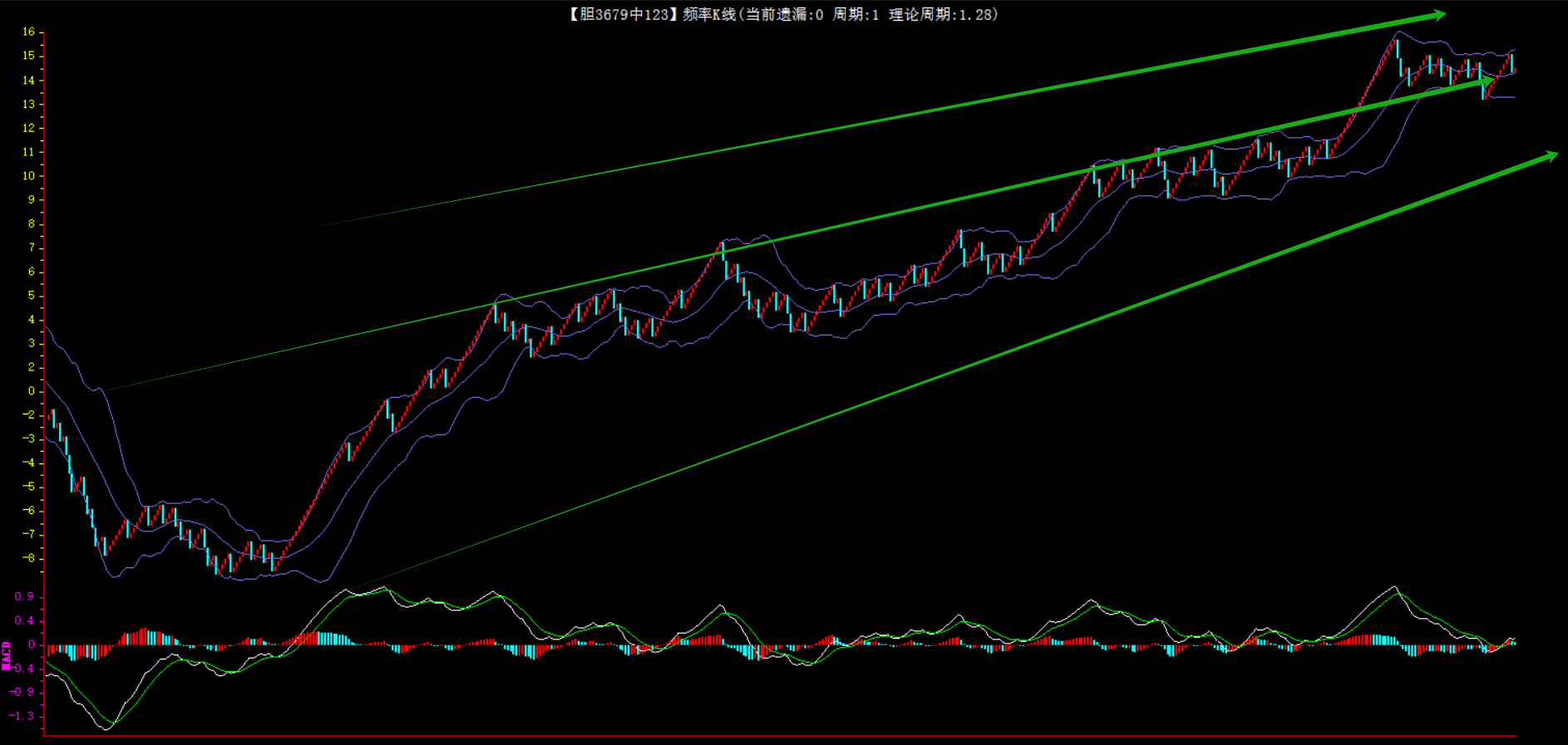 整体趋势上行,上边沿线趋势向上,下边沿趋势也是向上,节点震荡,当前连开3期,本期关注。