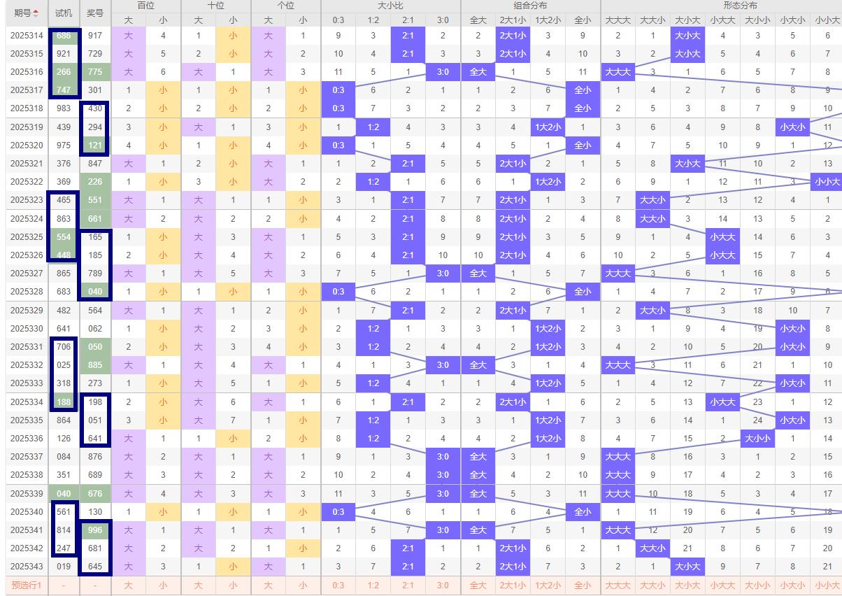 大小走势分析 - 大小比:343期开奖号码645呈现大小大形态,综合近期大小号的波动趋势,建议本期重点关注大小比为2:1或1:2的组合。