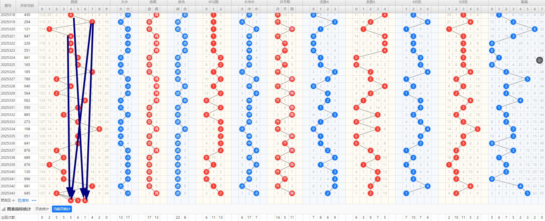 跨度预判 - 跨度:343期开奖号码为645跨度为2,属于中等跨度范畴。根据历史跨度数据的统计结果,近十期的跨度为8-5-5-2-3-1-3-3-7-2。012路比为3:2:5因此,本期建议关注.4.5.6..路的跨度。