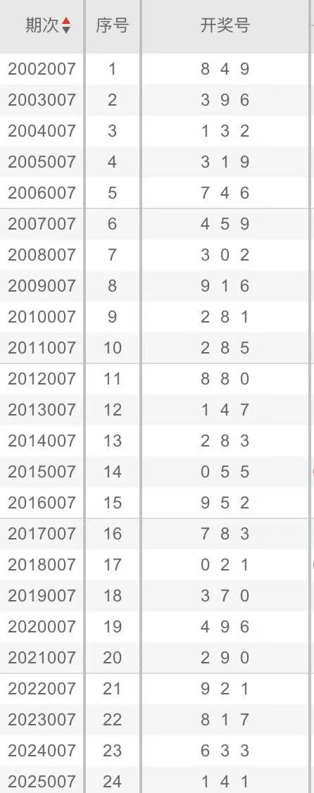 言归正传,分享第一个数据分析:统计历史同期开奖号码,依据追热不追冷的规律,出现次数最多的数字,大概率可以追热。以彩虹APP查询的历史同期开奖号码为例: