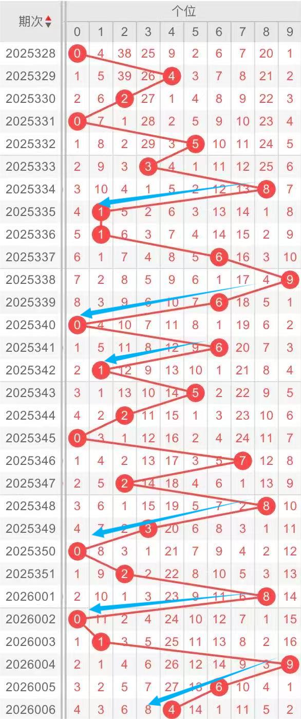 以近30期个位的走势形态分析:大跨度形态重复出现。例如:数字6-0/8-0/9-0大跨度重复开出。本期重点关注:以开奖号码6为中心开出跨度形态6-1/6-0。个人分析,仅供参考。