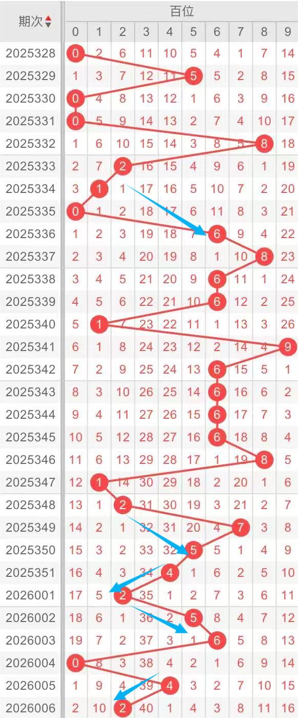 以近30期百位的走势形态分析:斜连和重复两种形态交替出现。例如:数字5-4/5-6/4-2斜连,数字6重复开出。本期重点关注:数字2-5可能再次开出斜连,同时关注号码6的重复。个人分析,仅供参考。