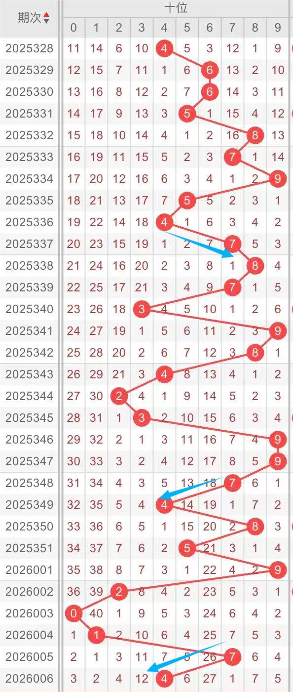以近30期十位的走势形态分析:斜连形态多次出现。例如:数字7-4的斜连形态。本期重点关注:数字4-8斜连开出,防7-8斜连开出。个人分析,仅供参考。