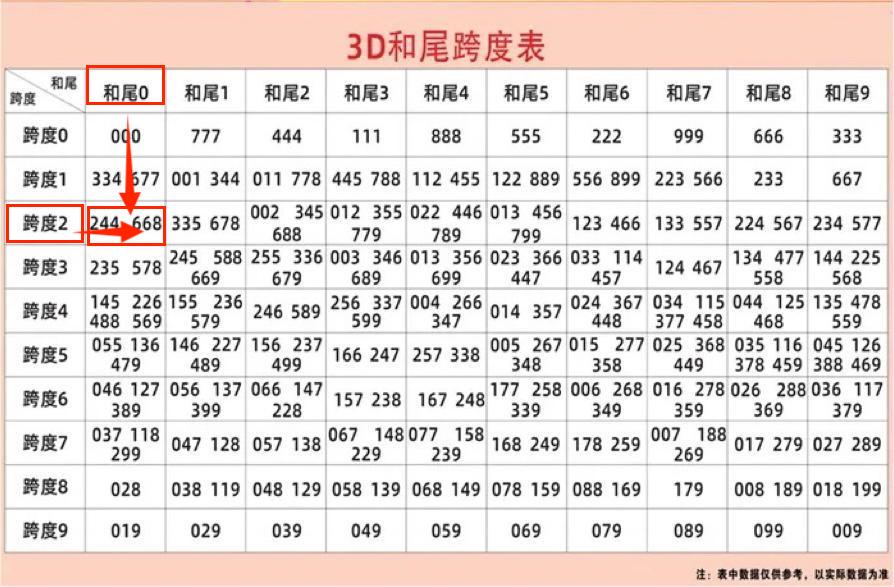 最后分享一个实用的3D和尾值与跨度值组合统计表。组合号码时,根据推测的和尾值结合跨度值,查找统计表上推荐的组合号码。以26006期为例:和值尾0、跨度值2,在统计表上查找的组合号码有:244/668,其中组合号码中出244(开奖号码244)。特别注意:统计表上推荐的组合号码,不是直选号码,不定位百十个位的顺序。仅供参考。