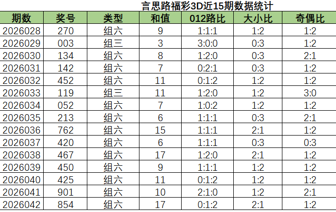 上期012路比是0:1:2,其中0:1:2占比变大,1:1:1占比变小。近15期内1:1:1是开出最多的,其次是1:2:0,0:1:2,最后是3:0:0,2:1:0,0:2:1,1:0:2。总的看2路最热门,其次是1路,最后是0路,本期看好1:1:1和1:0:2。