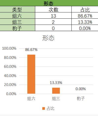 上期开的是组六,各个类型占比没有变化。通过图示可以看到,组六在15期内开了13期,组三开了2期。本期关注组六,防组三。