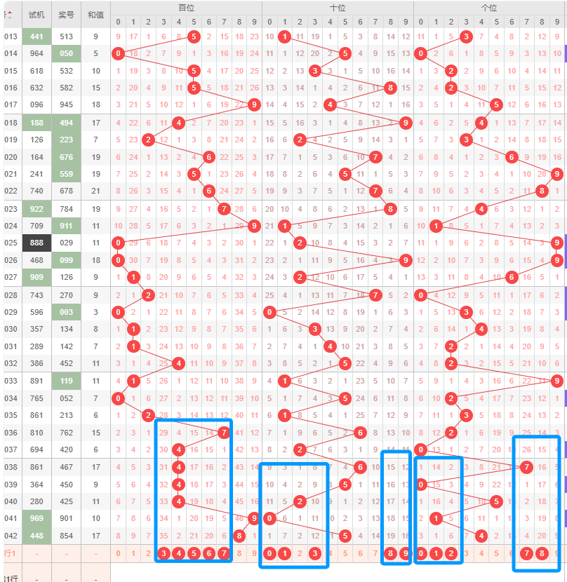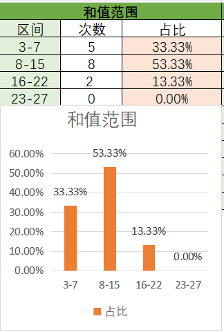 上期和值是17,处在16~22之间,其中16~22占比变大,8~15占比变小。目前是8~15占比最优,其次是3~7,最后是16~22。本期看好和值在8~15之间,其次是16~22。