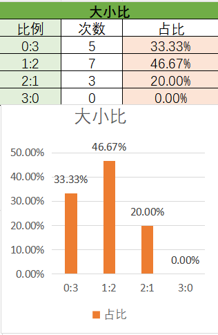 上期大小比为2:1,各个类型占比没有变化。可以看到近15期内1:2优势最好的,其次是0:3,然后是2:1。本期看好2:1开出,其次是1:2。