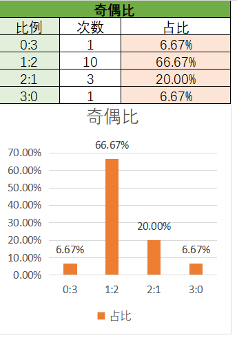上期奇偶比为1:2,各个类型占比没有变化。近15期内1:2优势最大,其次是2:1,然后是3:0和0:3。上期开了1:2奇偶比,本期还是看好2:1奇偶比的开出,其次是1:2。