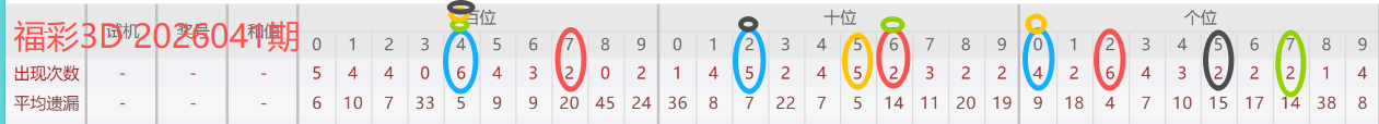 2026038期开奖号码467,我们可以看出近30期百位4出现4次,十位6出现2次(较040期减2),个位7出现2次(较040期减一)。