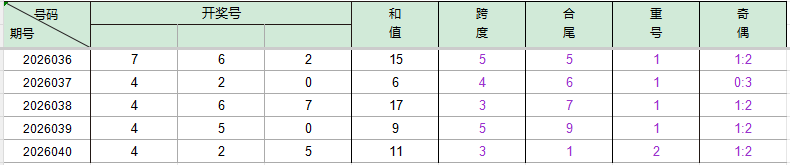 2026037期开奖号码420,我们可以看出近30期百位4出现3次,十位2出现4次,个位0出现3次。