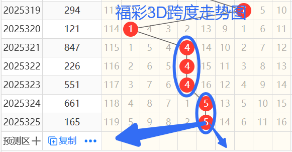 2)我们来看跨度;还是以321期——325期为例,如图依次是44455跨度,按照路数转换关系来看,那么跨度我们暂定1470369跨 ,本期个人比较看好6 0  跨。