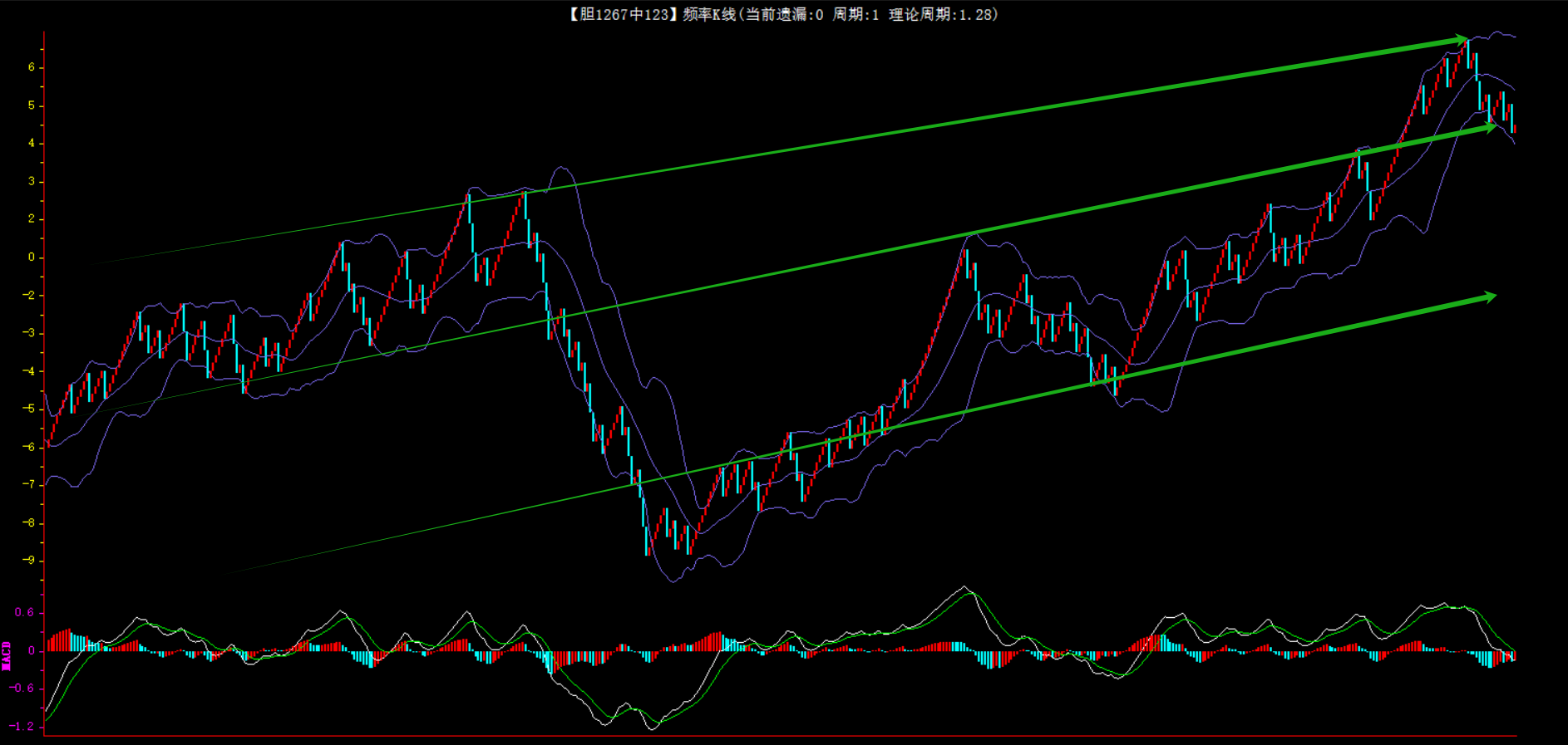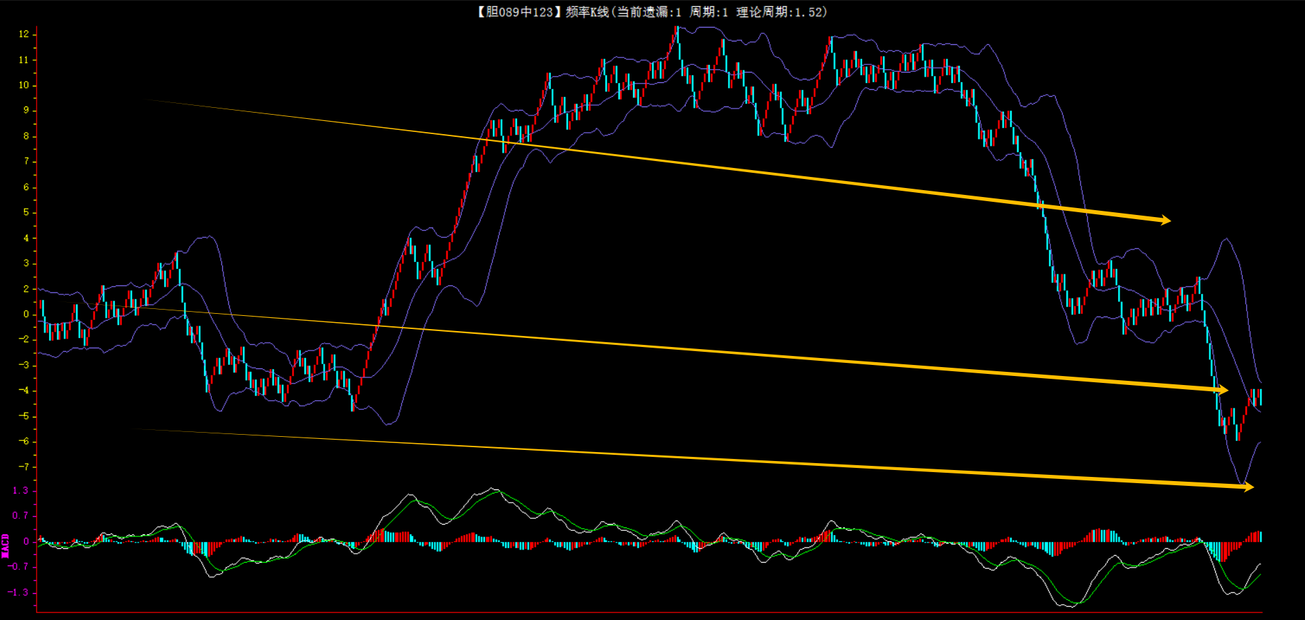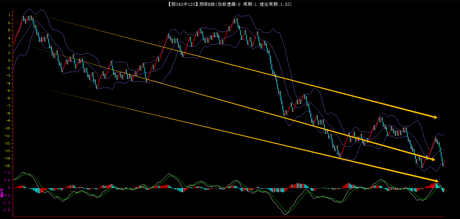 整体趋势下行,上边沿线趋势向下,下边沿趋势也是向下,节点震荡,当前遗漏1期,本期防守。