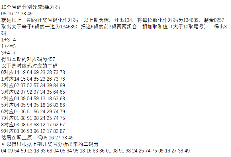 首先是把上期号码分别找出对应码和补码。再用第三期号码,斜线号码(上期百位,上上期十位,上三期个位),以及第十期号码,分别找出其对码和补码。最后再找出和上期号码的补码相同的号码来作为本期的胆码。如果相同的号码只有1个,可以用其对码和补码来补全为四码的胆组。以上期为例: