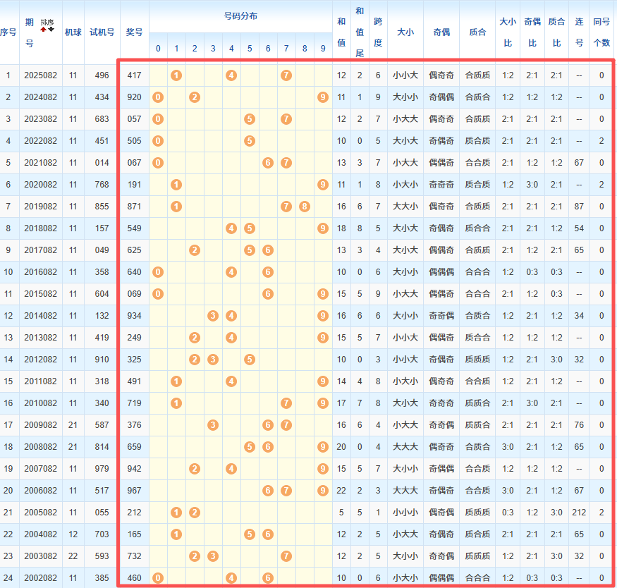 经统计0号出现7次、1号出现7次、2号出现7次、3号出现4次、4号出现8次、5号出7次、6号出现9次、7号出8次、8号出现1次、9号出现11次.统计后出现次数靠前的数字作为我们的备选号码.其号码有0124679等