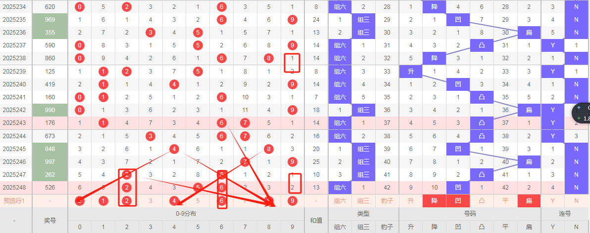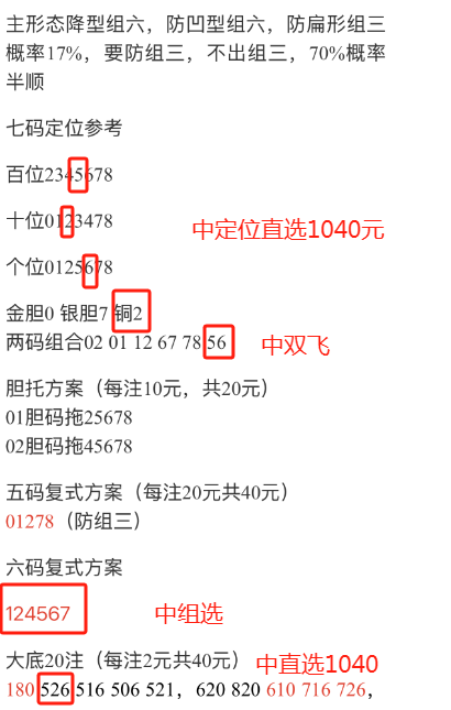 上期开出526,个位形态为大,为6,偶数,为0路,那么本期个位形态据以往开奖数据分析,可能给出的码有以下形态,重码6,邻码57,孤码045678,上图所示个位上期开出次数最多的02569,个位可以考虑26,十位形态2 为小,为2路,那么本期十位精析,邻码13,孤码045689,十位开出最多的02489十位考虑04,百位形态为大,为奇数,为2路,百位精析,重码5邻码46,孤号012789 百位出码走势最多的14289百位考虑91,这是分开数据分析,可以有一组五码复式01469。这里根据近三十期,百位,十位,个位,号码开出次数而选的范围,具有参考价值