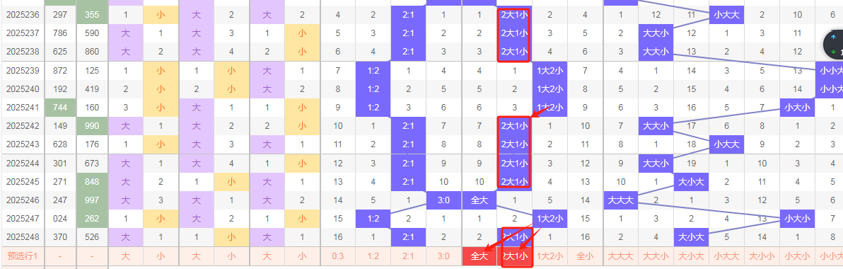 如图所示,上期开出2大1小,本期给的推测2大1小重,防全大顺位,个位01234 十位大码:56789 十百位大码:56789,接下来推测本期奇偶比