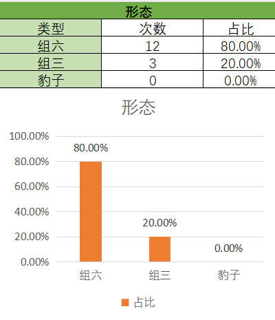 上期开的是组六,各个类型占比没有变化。通过图示可以看到,组六在15期内开了12期,组三开了3期。本期关注组六,防组三。