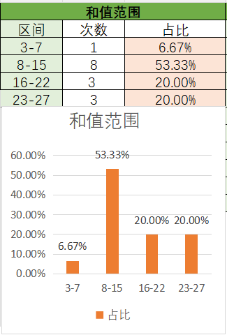 上期和值是13,处在8~15之间,其中8~15占比变大,3~7占比变小。目前是8~15占比最优,其次是16~22,23~27,最后是3~7。本期看好和值在8~15之间,其次是16~22。