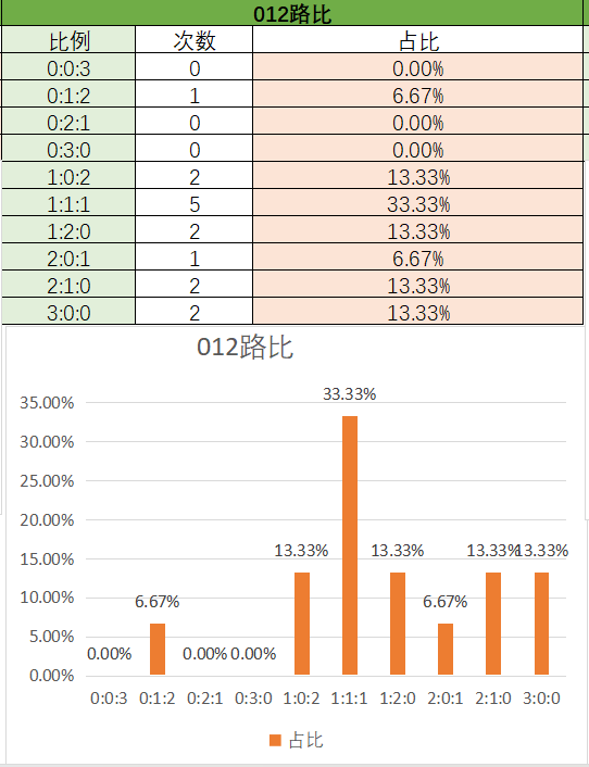 上期012路比是1:0:2,其中1:0:2占比变大,1:1:1占比变小。近15期内,1:1:1是开出最多的,次之是1:0:2,1:2:0,3:0:0,2:1:0,最后是2:0:1,0:1:2。总的看0路最热门,其次是1路,最后是2路,本期看好1:1:1和1:2:0。