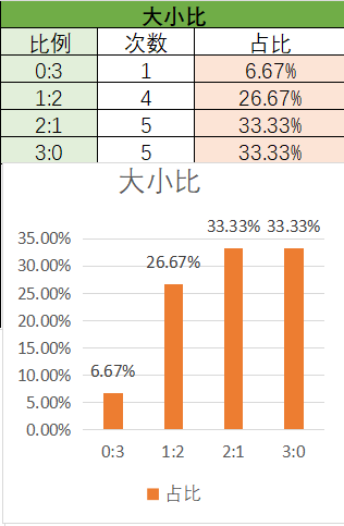 上期大小比为2:1,其中2:1占比变大,1:2占比变小。可以看到近15期内3:0和2:1优势最好的,其次是1:2,最后是0:3。本期看好2:1开出,其次是1:2。