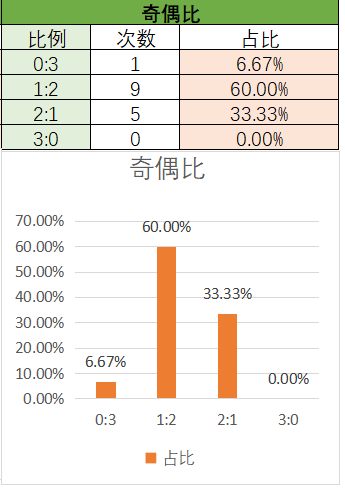 上期奇偶比为1:2,其中1:2占比变大,2:1占比变小。近15期内1:2优势最大,其次是2:1,最后是0:3。上期开了1:2奇偶比,本期看好2:1奇偶比的开出,其次是1:2。