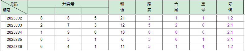 2025332期开奖号码885,我们可以看出近30期百位8出现2次,十位8出现4次,个位5出现4次。
