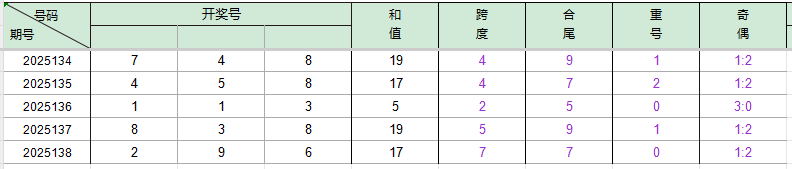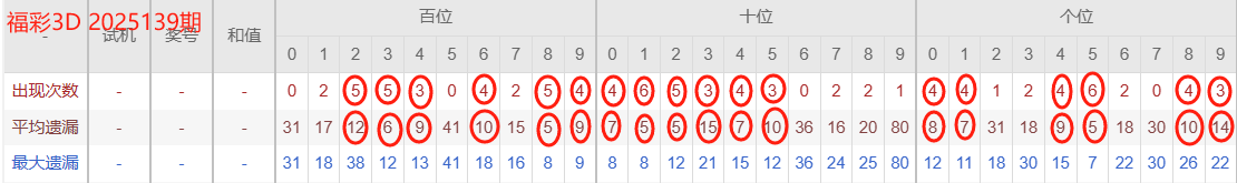 2025135期开奖号码458,我们可以看出近30期百位4出现3次(较139期减一),十位5出现3次(较136期减1),个位8出现3次。