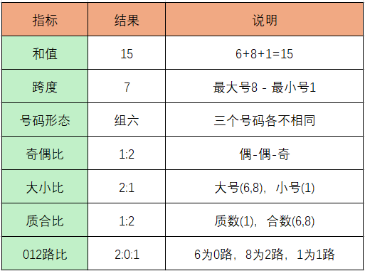 第2025342期开奖号码为 6, 8, 1。具体指标分析如下: