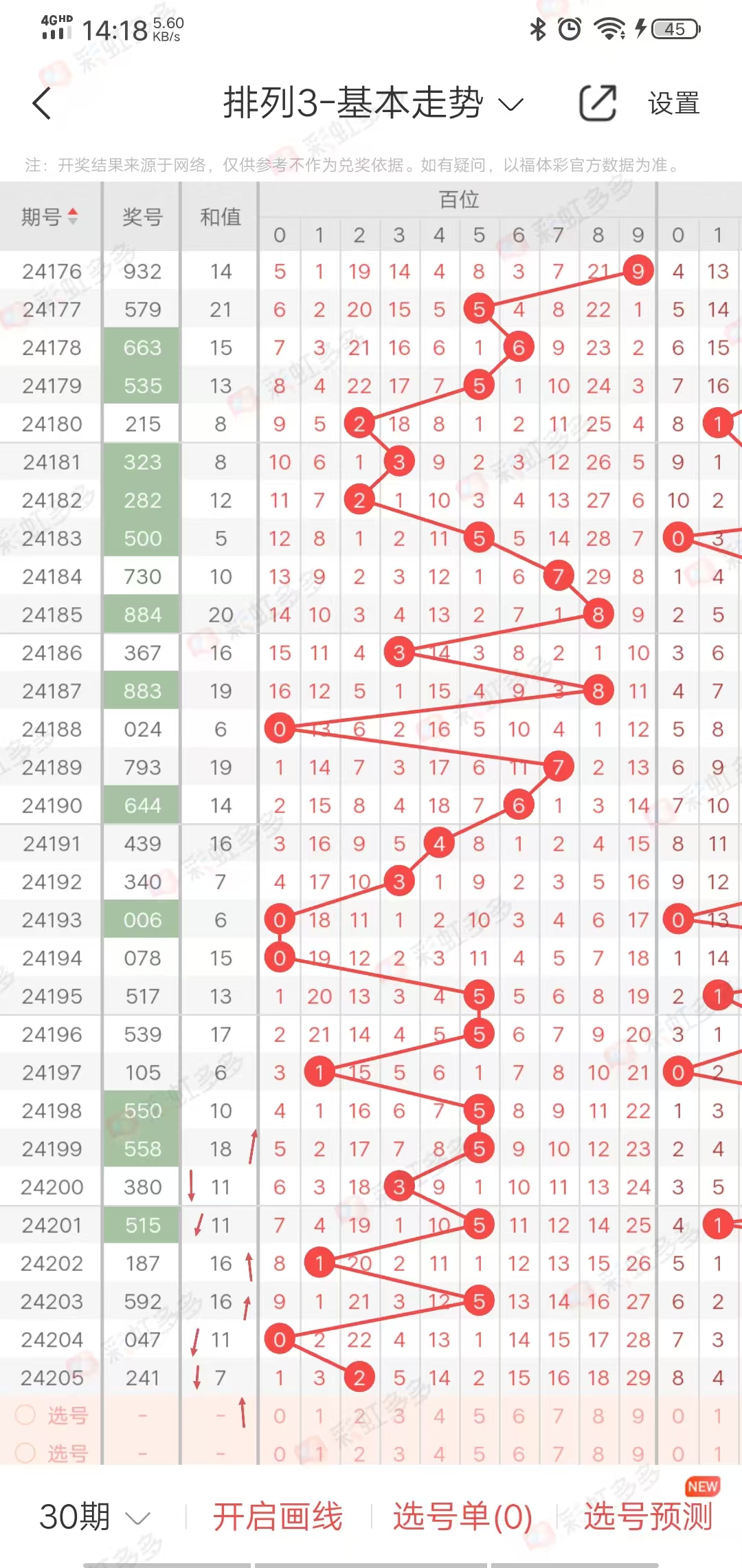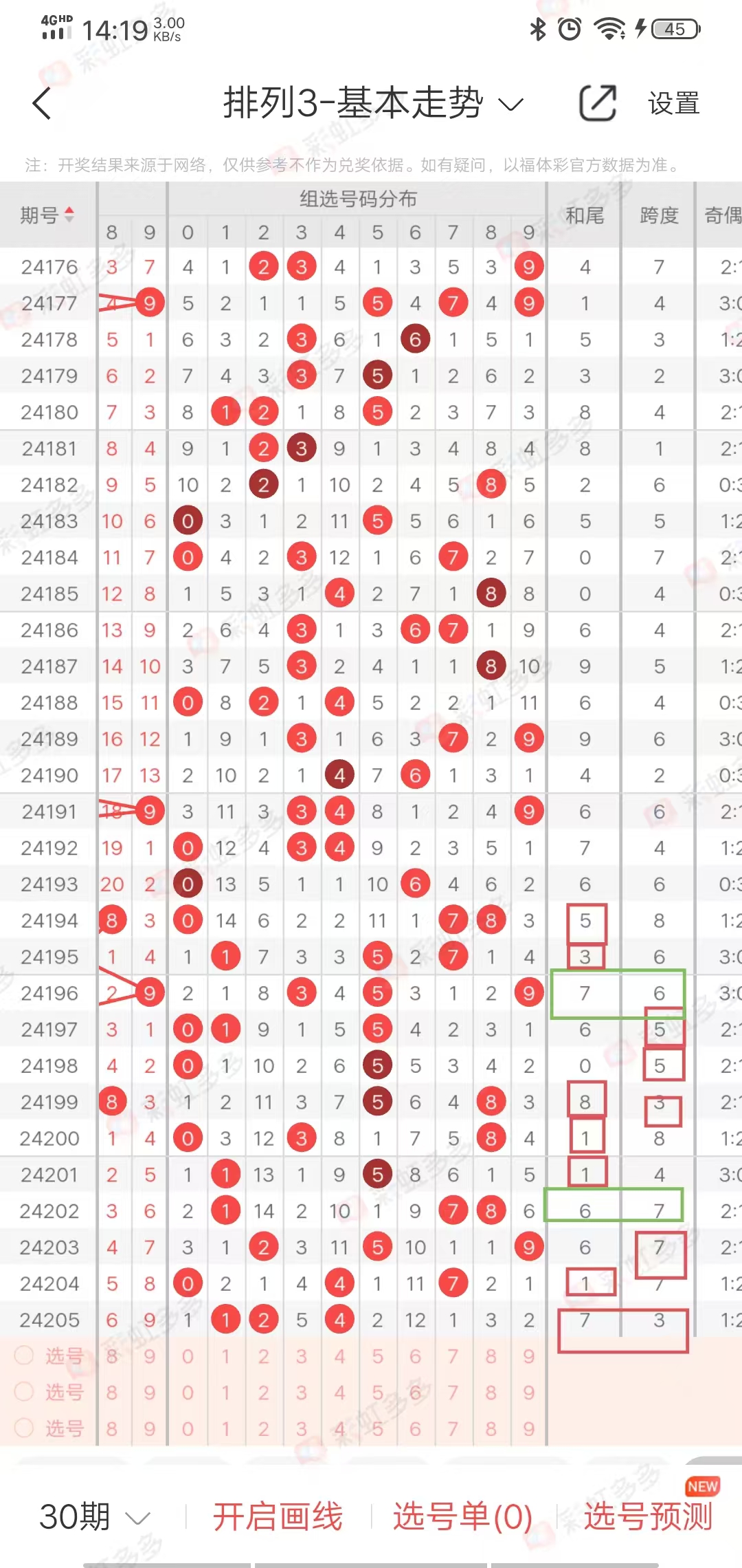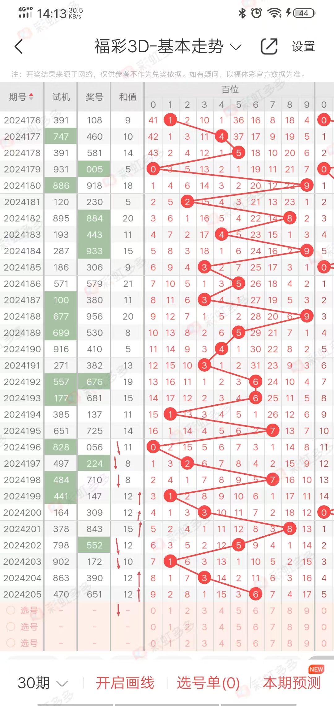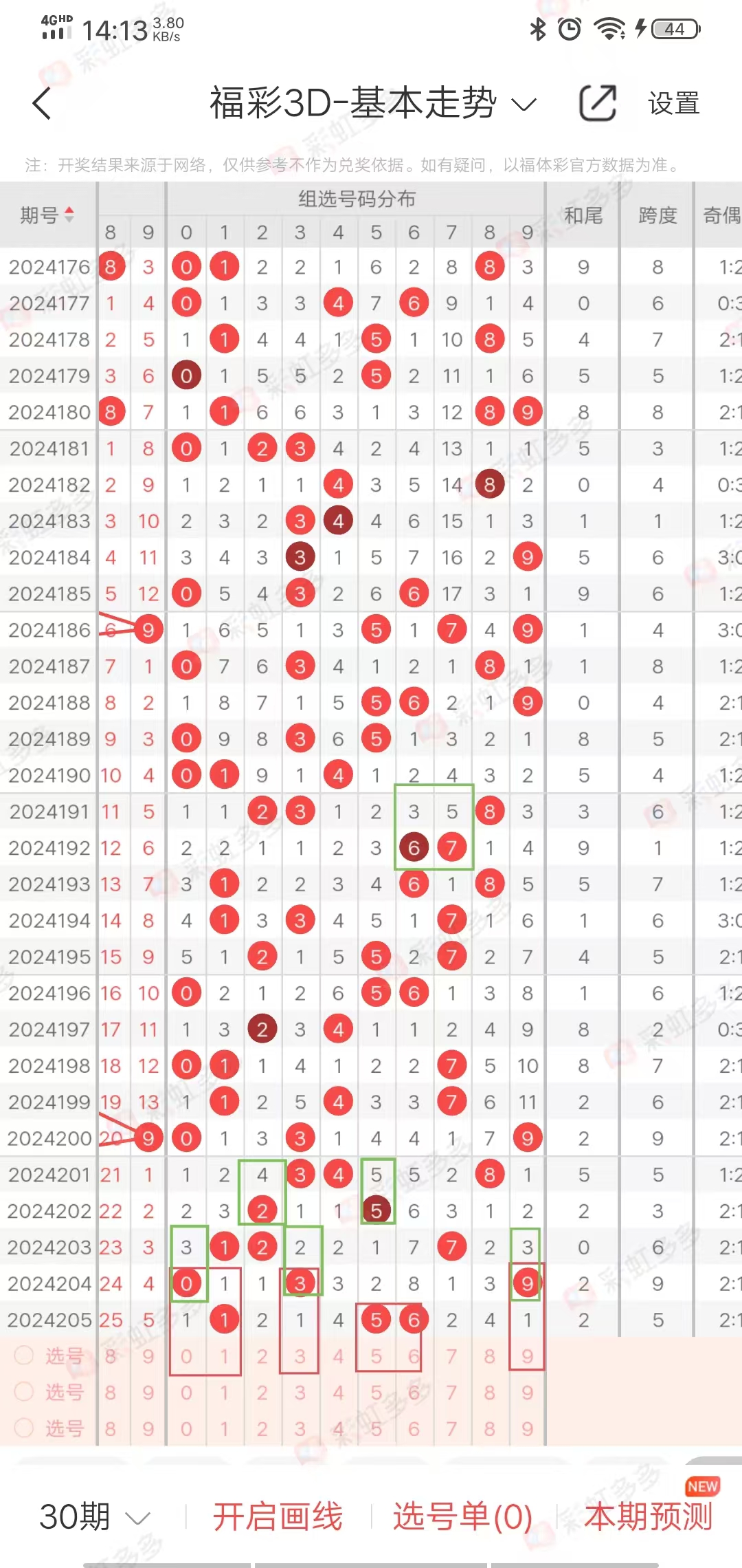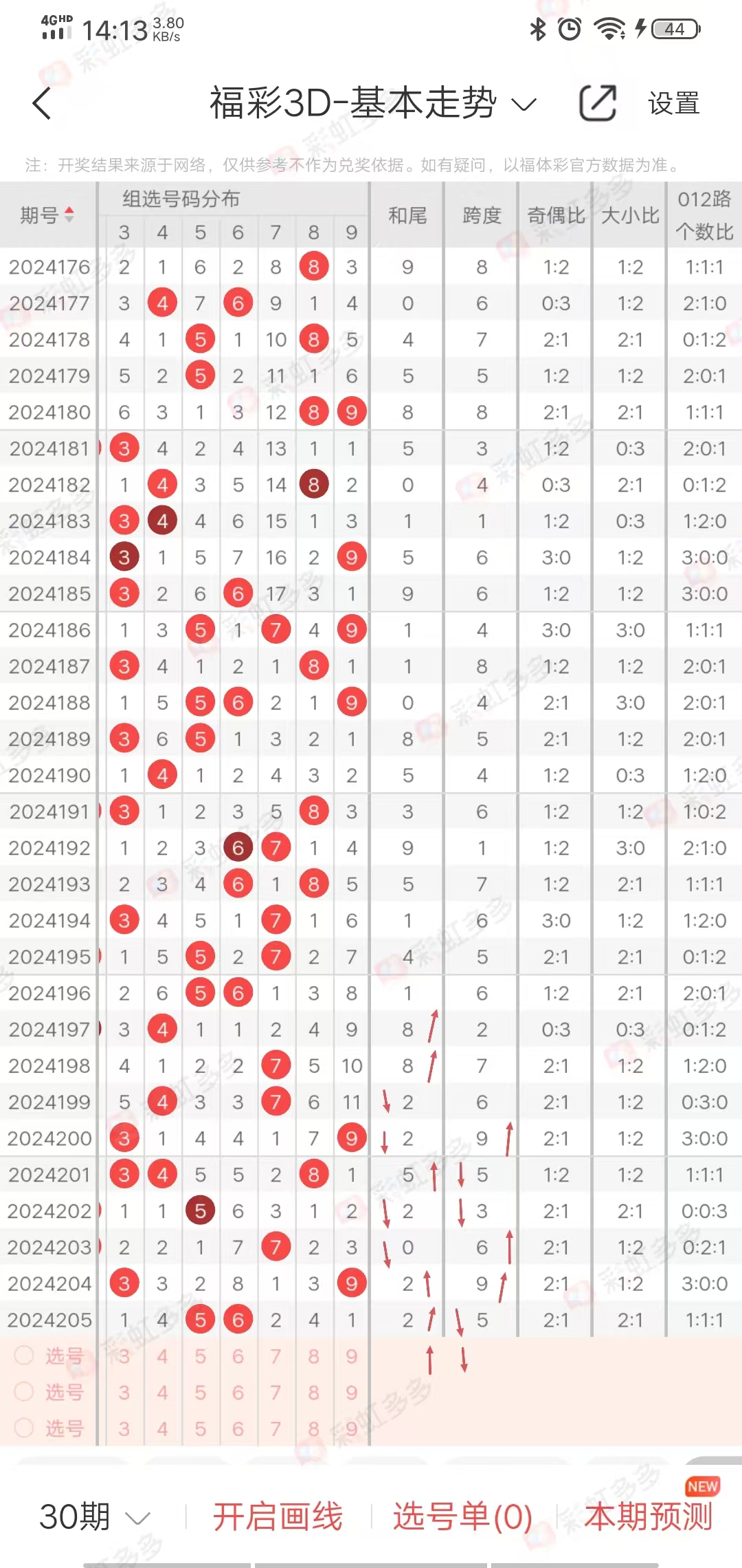 从走势图可以看出,近期跨度幅度-1➕2-4➕4-2➕2➕2-2➕0-1➕0-2➕5-4➕3-0-0-4,幅度在上下5左右,近10期有上下走势,上期下降,本期上升,综合跨度5-9之间
