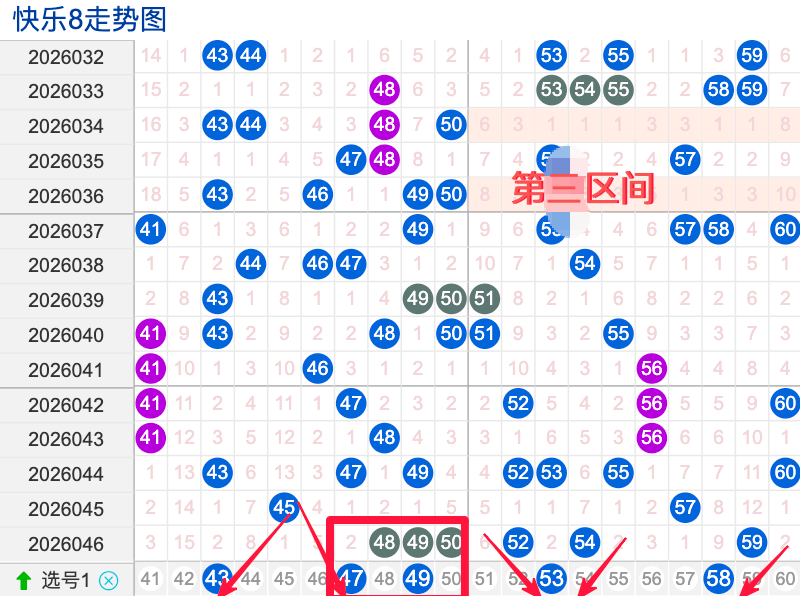 三区间开出了6个奖号(48.49.50.52.54.59)上期回顾三区开出6个奖号上期的三区间的奖号数量呈现一个递增的形态,4头回补2号码,本期先来看号码43期出现频率相对来说是很稳定。偶尔有时间隔期数也是很长,说明其在近期的开奖中较,号码47在近 30 期内出现次数相对较稳定的号码,近期的活跃度也是较。号码49有一定的间歇性,通常间隔5-3期会出现一次,有明显的连续出现态势,走势相对还不是很稳定,在整个第三区间的表现本期还是可以防守的。号码53走势相对近期较温热,近期有连续间隔落号的情况,活跃度近期处于较温热状态注意防守。