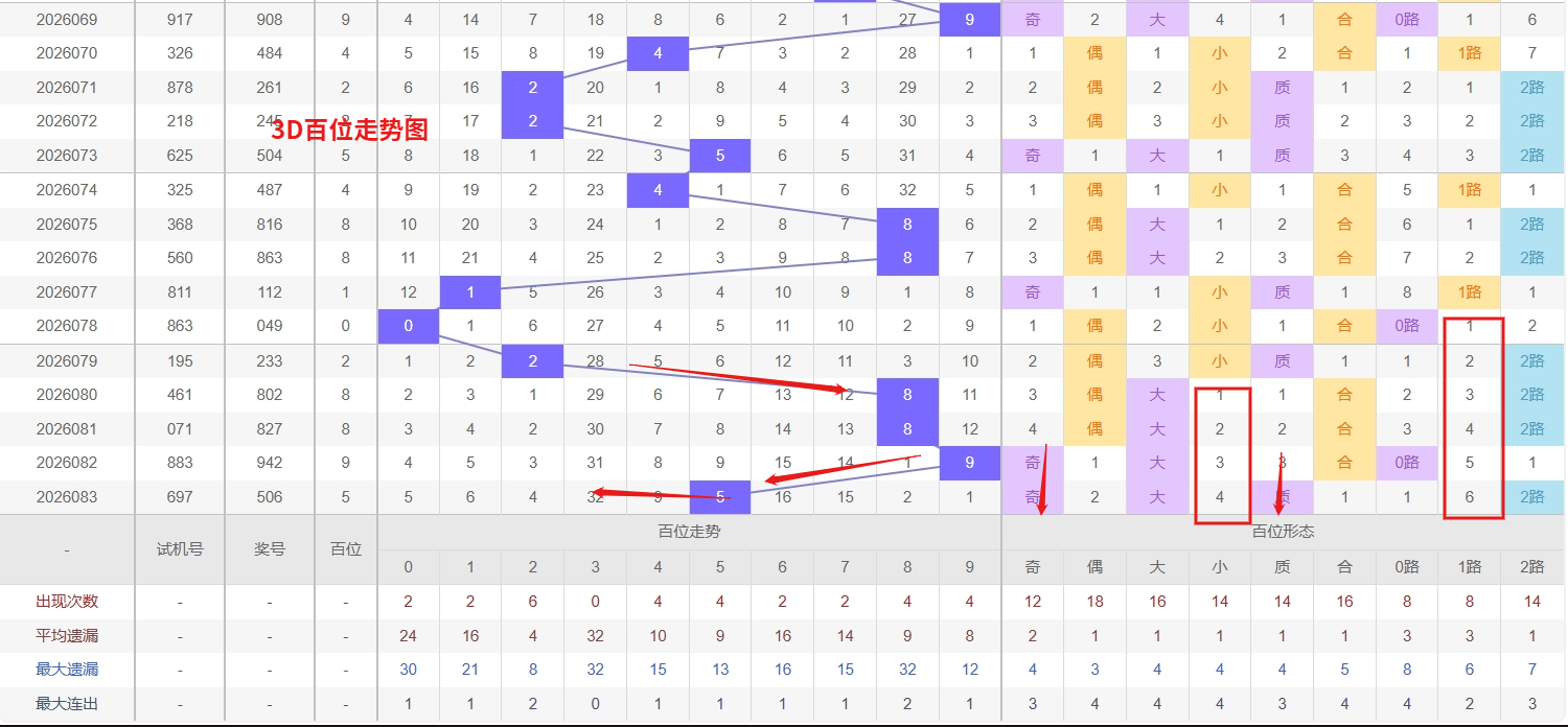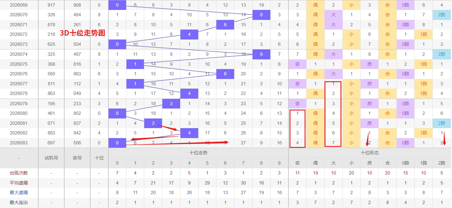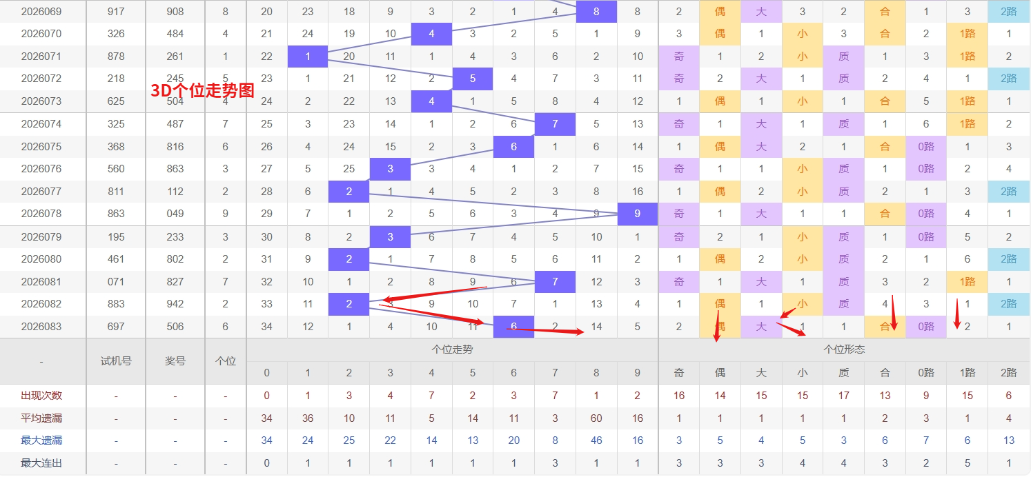 福彩3D个位分析:第2026083期个位开出号码6属于大偶数中端,从以上个位走势图中可以看出近100期的大小比约为53:47奇偶比约为54:46大小奇偶数据上有点差异有需求但不是太明显,不太好看这时就要借助连线走势和遗漏数据来帮助我们缩水号码。上期个位落号“6”大偶数0路号码球,号码开出了4振幅,连续多期的大振必被小振幅取代幅符合我们的预期,那么本期我们在个位考虑振幅走势走前依然要转变思路考虑大振幅,具体考虑(1-5)个振幅是我们主要的方向,那么在对个位落号情况进行系统的分析时我们可以明显的看到个位号码走势呈现大范围震荡,尤其是在号码的落位特点上表现的尤为突出,那么本期我们在个位分析时就要注意号码的风险,避免出现踏空。近期3D个位走势中,4和7作为热号表现十分活跃,两者交替或连续出现的频率较高,且近期没有出现长时间断层,说明个位当前对这两个号码的支撑力度较强。热号往往存在越热越跟的惯性,尤其是在整体冷热分布未发生明显逆转的情况下,4和7都有继续连下的可能,值得重点关注。与此同时,0则是典型的冷号,已经遗漏多期未现身,处于明显的冰点状态。从号码回补的规律来看,冷号在深度遗漏后往往存在一次反弹释放的需求,因此福彩3D第2026084期个位看好04789。本文由一起彩钱是生命动力所著,请勿转载