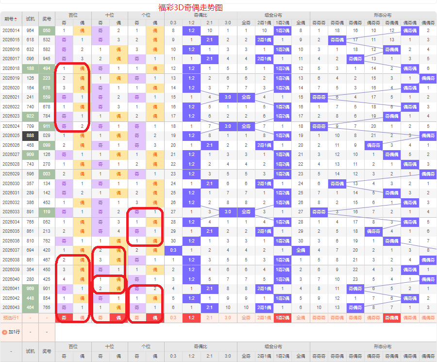 上期奇偶比是2:1,两奇的号码组合方式,从近五期的奇偶数出现情况看,奇数出现7次,偶数出现8次,奇数偶数号码出现较平均,本期侧重两偶的号码组合,侧重奇偶偶或奇奇偶的号码组合方式,根据奇偶形态做五码定位13579/02468/02468或13579/13579/02468