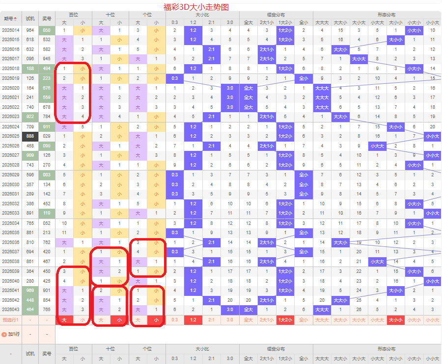 上期大小比为3:0,全大的号码组合方式,从近五期出现情况看,大号码出现8次,小号码出现7次,大小号码出现较平均,本期侧重两小的号码组合,本期百位侧重大号码,十位侧重小号码,个位要侧重看小,侧重大小小或者小小大的号码组合,根据大小做五码定位56789/01234/01234或01234/01234/56789
