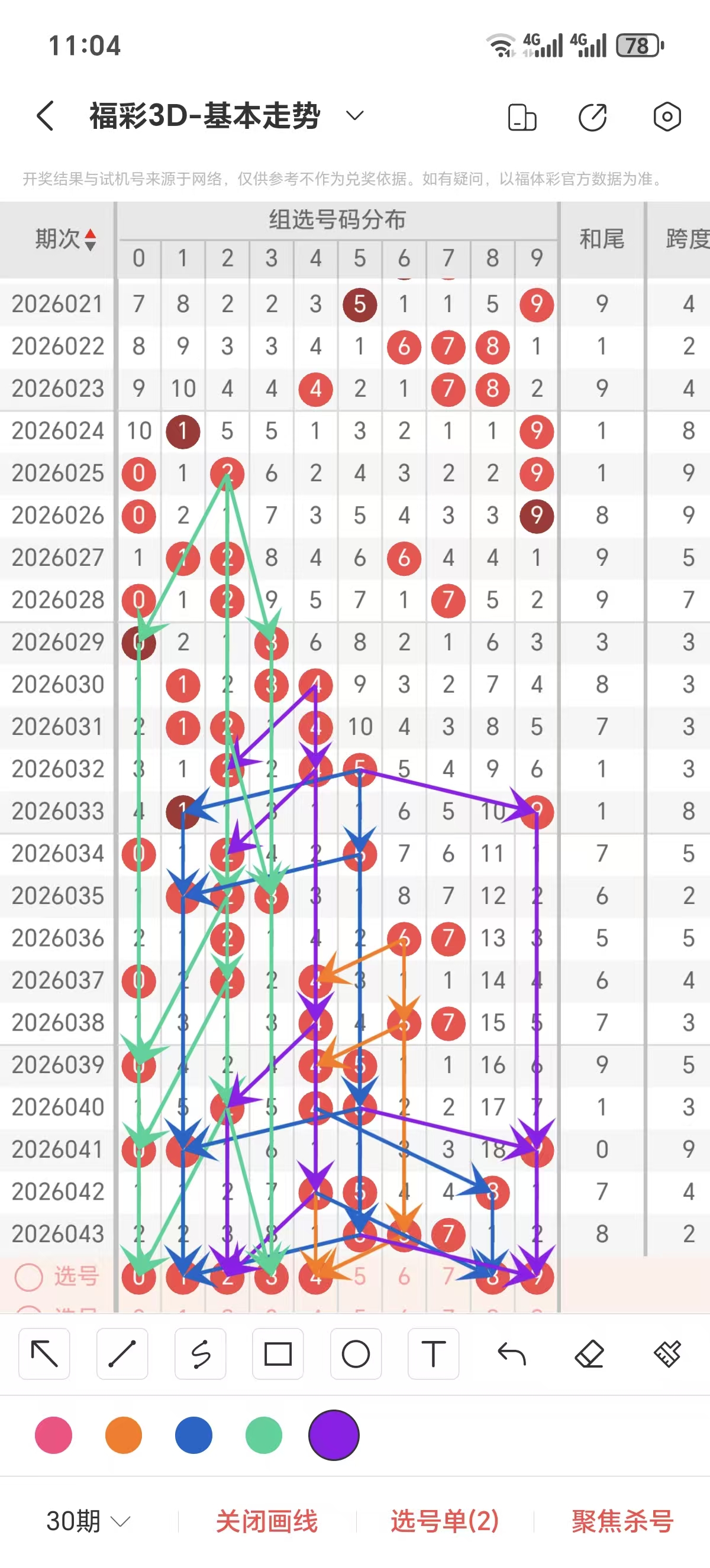 跨度通常情况下在五期之内重复一个跨度的概率很高,近五期没有重复的跨度,近五期跨度为5/3/9/4/2,近期02路的跨度较热,上期是2路的跨度,本期要侧重跨度以4/7/9跨为主的号码组合。可以从跨度方面选择相应的双胆码组合,双胆码的选取要根据近期和历史的走势进一步的分析选取。