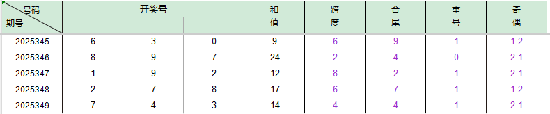 2025349期开奖号码743,我们可以看出近30期百位7出现2次,十位4出现5次,个位3出现2次。
