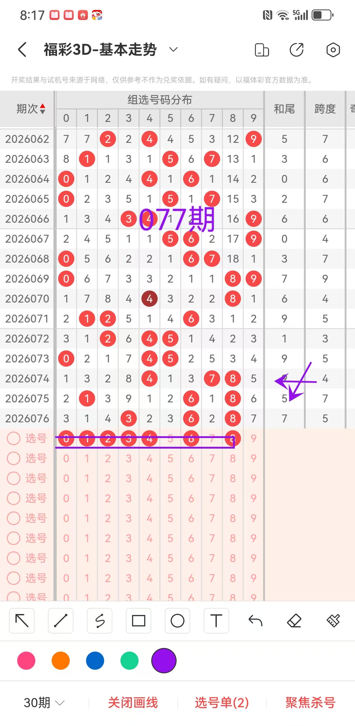 二、福彩3D2026第077期组选,尾,跨度,分析: