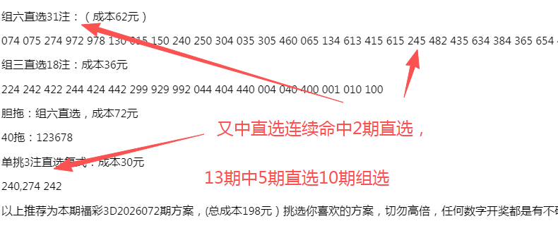 以上推荐为本期福彩3D2026077期方案,挑选你喜欢的方案,切勿高倍,任何数字开奖都是有不确定性,理性投资