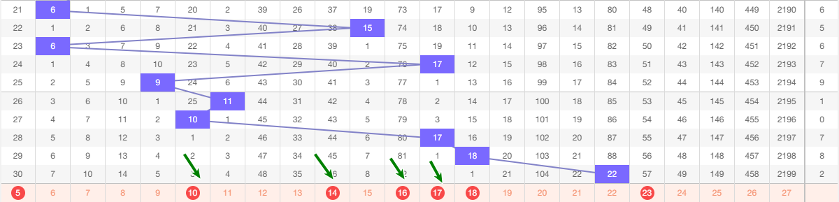(四)、和值 跨度 分析       和值图  本期看好 范围5-23 间定和值9-10-14-16-17从图上来看近5期的和值 11 10 17 18 22  10 22 为1路和值 18 0路和值 11 17 2路和值  本期看好2路和值参考  这五期和值波动不大 下期防守大波动