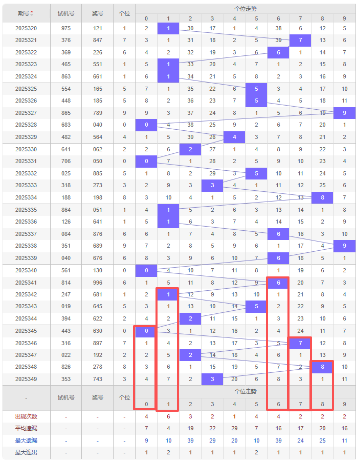 上期个位:3,近10期个位出号:0 6 1 5 2 0 7 2 8 3。最近10期大小变化分别:小大小大小小大小大小,奇偶变化分别:偶偶奇奇偶偶奇偶偶奇,质合变化分别:合合质质质合质质合质,根据近10期规律本期综上所述个位出号推荐5个号码:0 1 6 7 8。