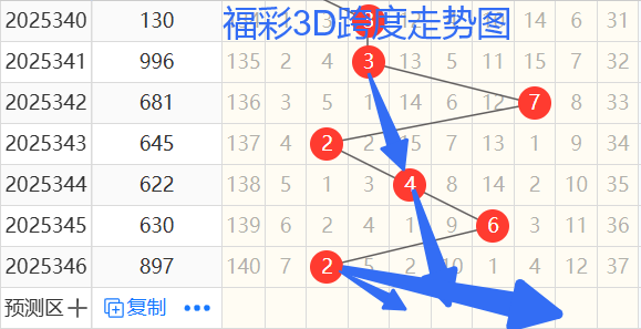 2)我们来看跨度;还是以342期——346期为例,如图依次是72462跨度,按照路数转换关系来看,那么跨度我们暂定258369跨 ,本期个人比较看好5 8 4跨。