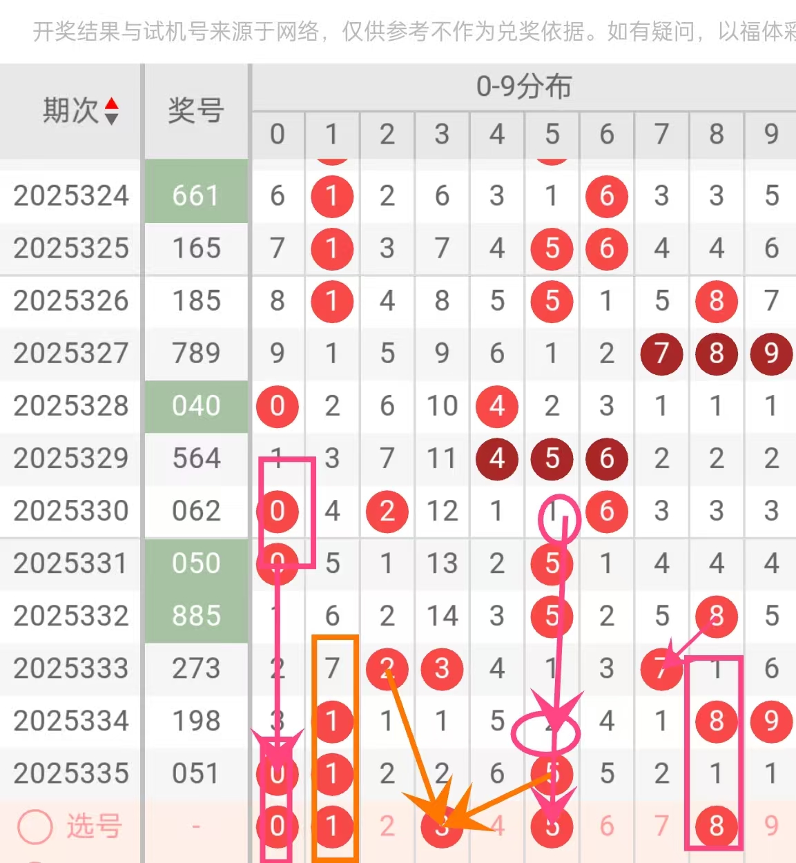 海青胆喻指“深藏不露、蓄势待发”的号码,通常具备较长的遗漏潜力或即将结束冷态。数字“0”近30期仅出现7次,相对偏冷,但最近5期已出现2次(2025335、2025331),呈现明显的“回暖迹象”。该号码多出现在首尾位置,且常与“5”“1”形成“小零组合”,具有一定的结构召唤力。从历史周期看,“0”在冷态结束后常迎来连续出号,下期有望从“深海”中浮出,成为意外之喜。
