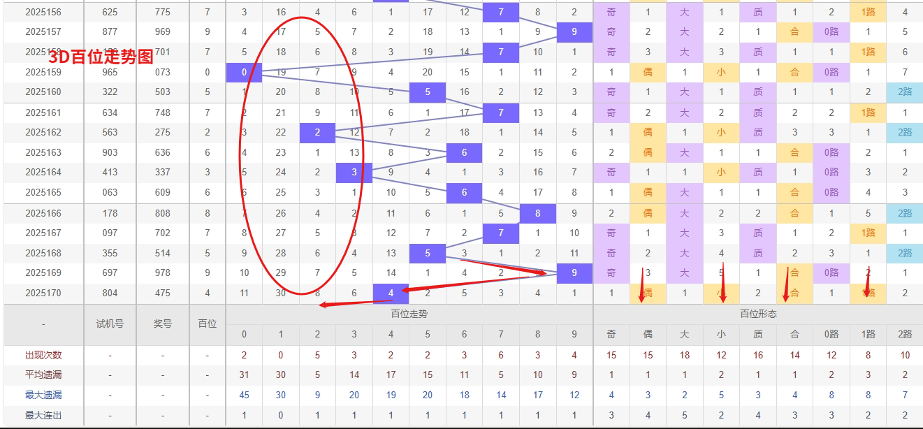 福彩3D百位分析:第2025170期百位开出号码4属于小偶数,从上面百位走势图上可以看出近100期大小比约为48:52奇偶比约为51:49。近期数据还是比较极端的符合文章开头介绍的求均衡规律非等量现象。但这种均衡不会持续最终会被偏态运行打破,然后循环往复。但短期内大小相差5点,大数过热小数有回补需求本期个人认为走小数的概率更高。上期百位落号“4”号球,在百位号码开出1路号码4后向小数方向走出5个振幅。那么通过分析上期百位落位号码分析,号码走出5个振幅,号码走为小偶数,开出1路号码4。通过对百位落号趋势来分析,百位号码落位前端,通过对近10期的走势来看百位号码大小交替频繁走3期大数又走2小数,最近小数比较强势,本期有继续走向小数号码的概率。那么本期我们在对百位号码进行分析时我个人的考虑百位号码会走出小数号码球,近期3D百位走势呈现冷热交替态势,其中数字1作为冷号已遗漏30期,接近历史平均遗漏值(约35期),需开始关注其回补可能;而数字4虽然刚刚解冻开出,但此前经历了较长的遗漏周期,存在一定的连下概率,尤其近期百位频现"冷后回补"的走势特征。热号方面,2和7表现尤为活跃——2近10期开出3次形成短期热态,7则呈现"隔期对称"走势,这两大热号仍需重点防守。我们在百位关注的重点在21457这5个号码球上,百位号码近期奇偶切换频繁,4号球码属于1路号码偶数,现偶数开出过多有向奇数的趋势。所以福彩3D第2025171期百位看21457。