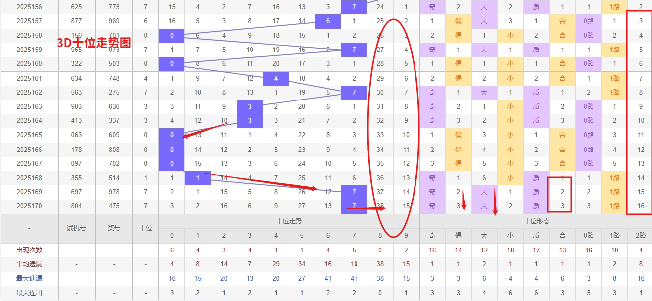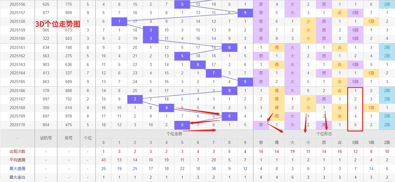 福彩3D个位分析:第2025170期个位开出号码5属于大奇数中端,从以上个位走势图中可以看出近100期的大小比约为51:49奇偶比约为52:48大小奇偶数据上有点差异有需求但不是太明显,不太好看这时就要借助连线走势和遗漏数据来帮助我们缩水号码。上期个位落号“5”大奇数2路号码球,号码开出了3振幅,连续多期的大振必被小振幅取代幅符合我们的预期,那么本期我们在个位考虑振幅走势走前依然要转变思路考虑大振幅,具体考虑(1-6)个振幅是我们主要的方向,那么在对个位落号情况进行系统的分析时我们可以明显的看到个位号码走势呈现大范围震荡,尤其是在号码的落位特点上表现的尤为突出,那么本期我们在个位分析时就要注意号码的风险,避免出现踏空。近期3D个位走势冷热分化明显,其中0和2持续低温,0已平均遗漏43期,回补压力逐渐增大;2则遗漏14期,同样超出常规冷态范围,需警惕其随时解冻反弹。与此同时,热号方面6和9近期表现活跃,但冷号回补往往伴随热号降温,因此对0和2的防守尤为关键。采取"防冷为主,兼顾热态"的策略,重点关注冷号0的斜连回补信号及2的对称转折点,因此福彩3D第2025171期个位看好20679。