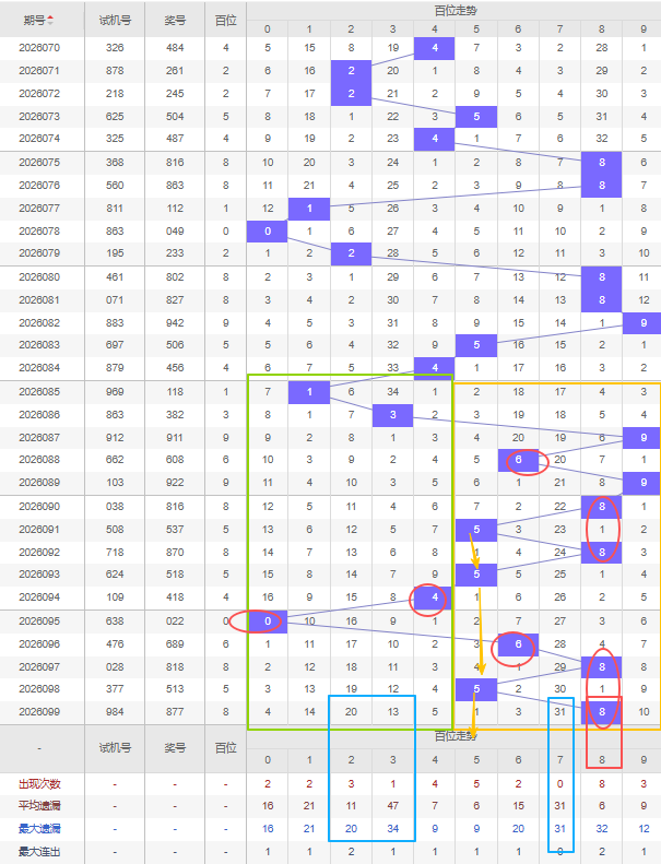 福彩3D第2026100期百位首先分析本期百位奇偶数的形态,可以看到近15期开出偶数号8期,奇数号7期,开出奇数号的概率比开出偶数号的概率相差不大,近五期开出了4期偶数号上一期开出偶数8号,根据以上所述本期看好开出奇数号。推荐考虑遗漏期数较大的奇数号,比如冷号可以考虑3号、7号都已经遗漏十期以上,而且7号是百位遗漏期数最大的号,开出几率较大建议考虑防冷号开出。杀号建议定在偶数号,但2号都遗漏十期以上达到了最大遗漏期数,可以考虑防冷号开出。另外近十五期只出现一次重号,可以防重号开出考虑8号。