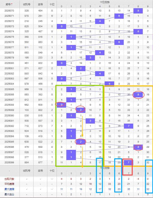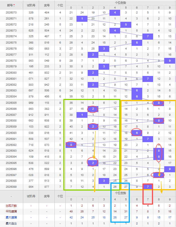 福彩3D第2026100期个位先分析奇数偶数,近十五期开出奇数号5期,开出偶数号10期,开出偶数号的概率比开出奇数号的概率大不少。近十余期都是奇数偶数间隔开出的,上一期又开出了奇数7号,近五期已经出3期奇数了本期还是看好开出偶数,建议考虑遗漏期数较大的偶数号,比如4号遗漏十期以上且达到平均遗漏期数和最大遗漏期数,都可以防冷号开出。其次近十五期只有一次重号开出,那么本期继续看好7号开出。