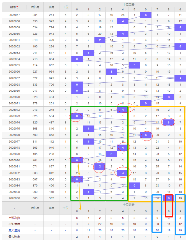 福彩3D第2026087期十位建议分析奇数偶数概率,如图所示近十五期开出奇数号5期,偶数号10期,开出奇数号的概率比开出偶数号的概率要小太多 。近十五期开出偶数和奇数时连出几率大,大多为连出几期又奇偶间隔着开出,上一期开出的偶数8号在这之前连出了有过6期偶数号了。那么本期开出偶数号的概率较大,本期看好十位将继续开出偶数号,建议选择遗漏期数较大的偶数号开出,比如近十五期都没有开出过重号,那么本期继续看好8号重号开出。其次0号已经三期未开出,若开出则形成2-3的形态。建议杀号定在所有奇数号,但是两个奇数冷号依旧可以防冷号开出。