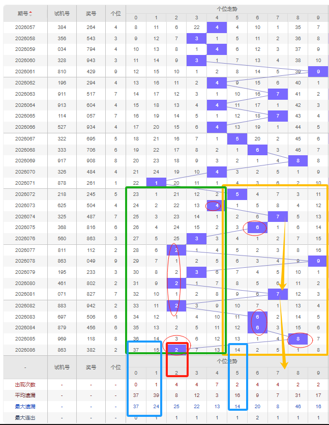 福彩3D第2026087期个位先分析奇数偶数,近十五期开出奇数号6期,开出偶数号9期,开出偶数号的概率比开出奇数号的概率大。近十余期都是奇数偶数间隔开出的,上一期又开出了偶数2号,本期还是看好增加奇数,建议考虑遗漏期数较大的奇数号,比如1号和5号遗漏十期以上且5号达到平均遗漏期数和最大遗漏期数,都可以防冷号开出。7号若开出则形成6-5的形态。